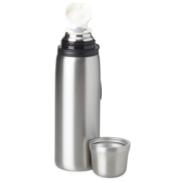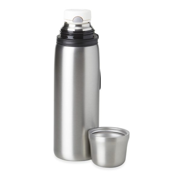 Garrafa térmica feita em inox 304 com parede dupla, capacidade de 850ml. Com alça emborrachada para transporte, a garrafa contém filtro infusor, tampa com botão de acionamento e tampa externa utilizável como copo.