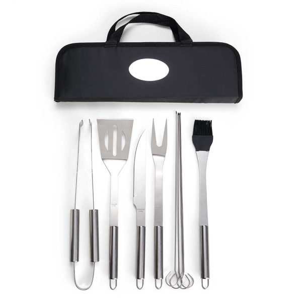 Kit Churrasco 9 Peças em estojo de nylon com alça. Possui: pegador, garfo, espátula, faca, pincel e 4 espetos em inox, acompanha proteções plásticas e parte interna com velcro para guardar as peças.