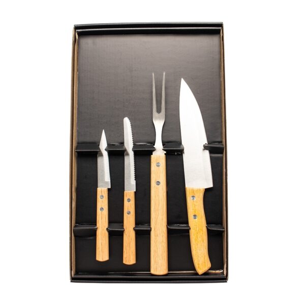 Kit para preparar os churrascos mais deliciosos, composto por cinco peças com lâminas em aço inox e cabos de madeira. Inclui três facas de 3″, 4″ e 6″ polegadas, um garfo e uma tábua de bambu, todos acomodados em uma caixa de papelão. É a escolha perfeita para quem aprecia uma boa carne em momentos de conivência.