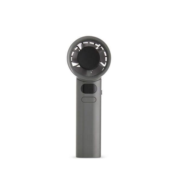 Mini ventilador recarregável em plástico e metal. Possui controle de velocidade ajustado por botões frontais, acionamento por chave seletora e painel de LED que exibe níveis de velocidade e carga da bateria. Acompanha cabo USB-C e cordão em nylon.