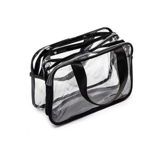 Nécessaire de PVC. Possui dois compartimentos e duas alças laterais de mão em nylon.