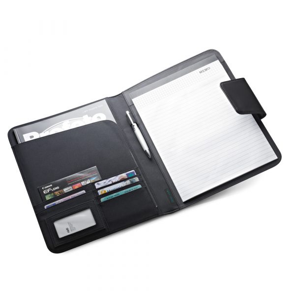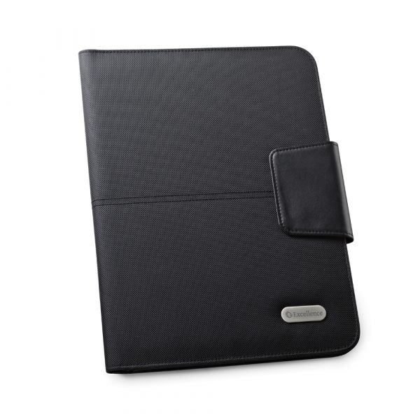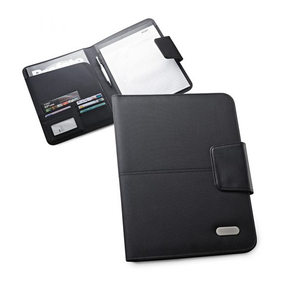 Pasta A4 em c. sintético e 1680D. Fecho magnético e bloco com 20 folhas pautadas. Esferográfica não inclusa. Placa disponível para personalização. 245 x 325 x 15 mm | Chapa: 45 x 15 mm