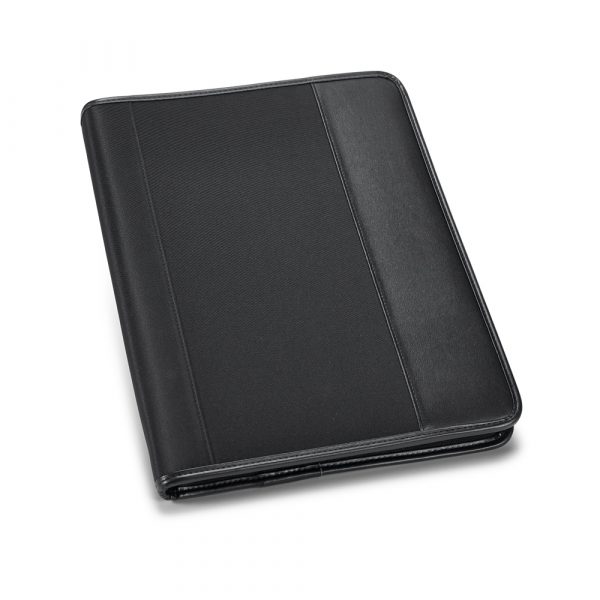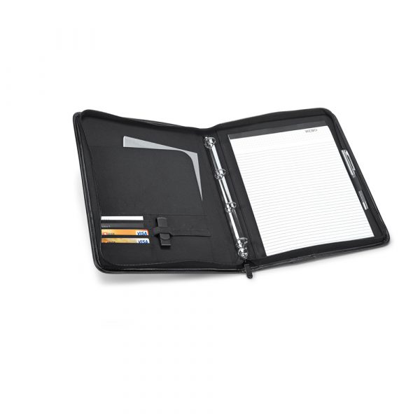 Pasta A4 em c. sintético e microfibra com 4 argolas de 20 mm e caderno com 20 folhas pautadas. Pen drive não inclusa. 265 x 340 x 45 mm