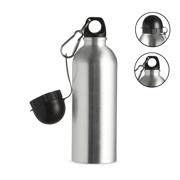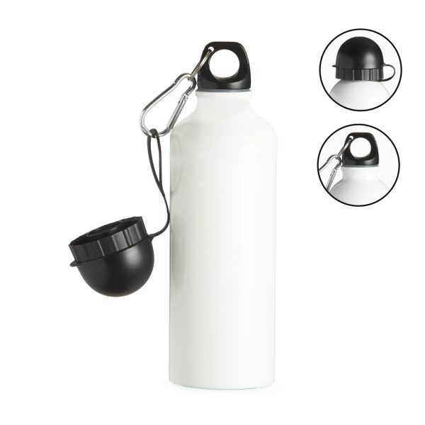 Descrição: Squeeze 500ml de alumínio com acabamento para sublimação, tampa rosqueável e acompanha um segundo bico com mosquetão (não é térmico).