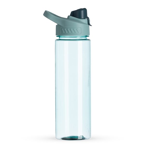 Squeeze plástico 700ml com alça para transporte, possui tampa principal rosqueável e tampa de proteção plástica com trava para o bocal.