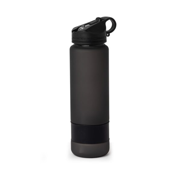 Squeeze plástico com capacidade de 900ml com acabamento fosco e detalhe emborrachado na parte inferior. Possui tampa rosqueável com alça integrada e bico de canudo com tampa protetora. Acompanha canudo.