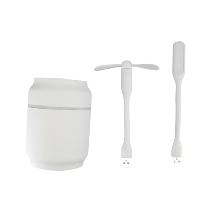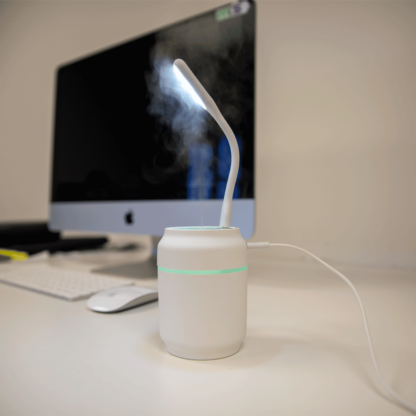 Umidificador de mesa com 200ml de capacidade, funcionamento por 8 horas, carregamento via USB e iluminação colorida, caso desejado. Ele possui uma saída USB para encaixe de lâmpada Led ou ventilador, ambos inclusos na compra.